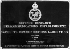 Plaque commemorating the opening of the 9.1m satellite communications antenna by A.H. Zimmerman, Chairman of the Defence Research Board, June 1, 1966. |